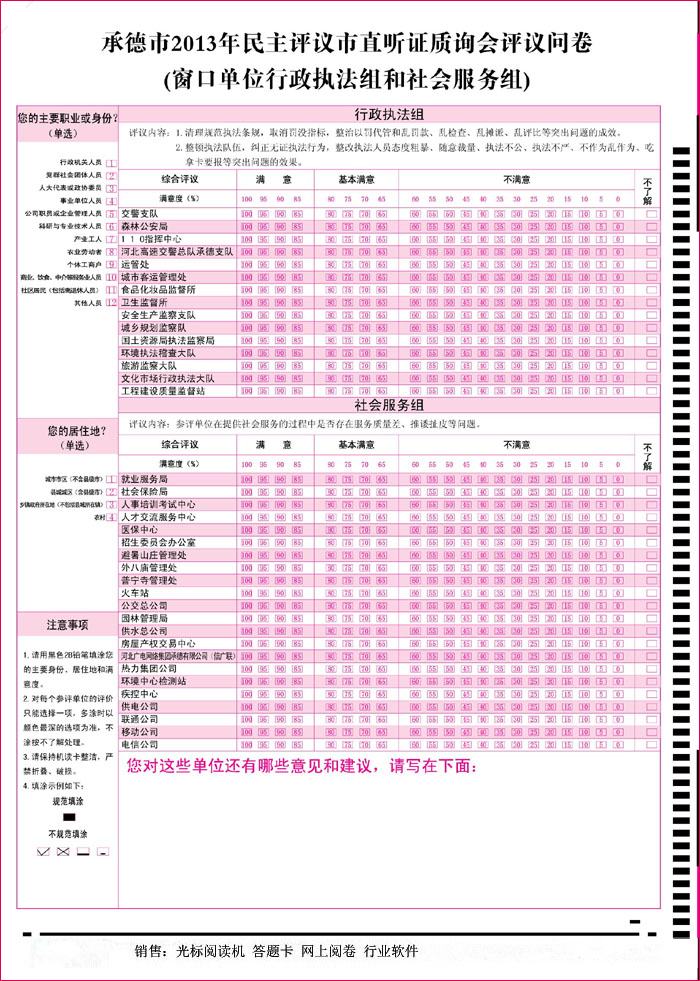 我公司對各種招聘,閱卷,考核活動都有專用機器和軟件配套使用,光標閱讀機租賃和閱卷機租賃。公司供應各種高端型號國內大、中、小學標準化考試,教學評估、學籍管理等光標閱讀機以及各種客戶端的網上閱卷系統。我公司擁有眾多經驗豐富的軟、硬網絡工程師,可以為您提供完整的基于WINDOWSNT、NETWARE及INTERNET/INTRANET的網絡方案,歡迎垂詢,歡迎選購。同時也向廣大用戶提供配套的信息卡設計及高質量的印刷服務,價格優惠。產品售出后,免費保修三年,終身維護。后續應用軟件免費升級。適用范圍:考試閱卷,學籍管理,招生報名,教學評 ,人口普查,民意,競賽抽獎,納稅申報,記賬憑證,調查,健康、滿意度、疾病調研,案例分析,戶籍管理服務電力系統:干部廉正,員工考核,干部選舉,民主選舉,民主測評,干部考核,換屆考察,年終考核,人事測評,崗前測評,市場問卷,心理測試等大、中、小學標準化考試,教學評估,學籍管理等領域。